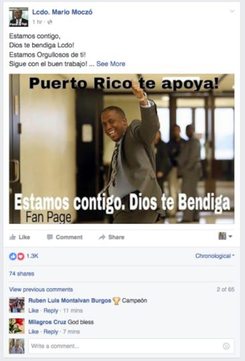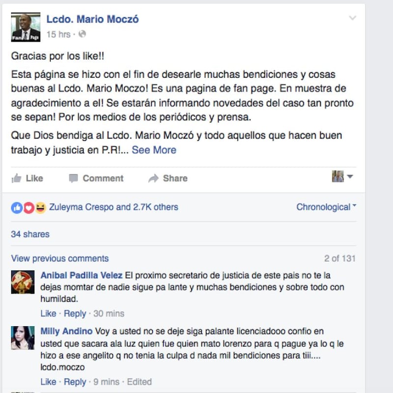 “Esta página se hizo con el fin de desearle muchas bendiciones y cosas buenas al Lcdo. Mario Moczo! Es una pagina de fan page. En muestra de agradecimiento a el! Se estarán informando novedades del caso tan pronto se sepan! Por los medios de los periódicos y prensa”, cita una de las publicaciones del perfil de Facebook.