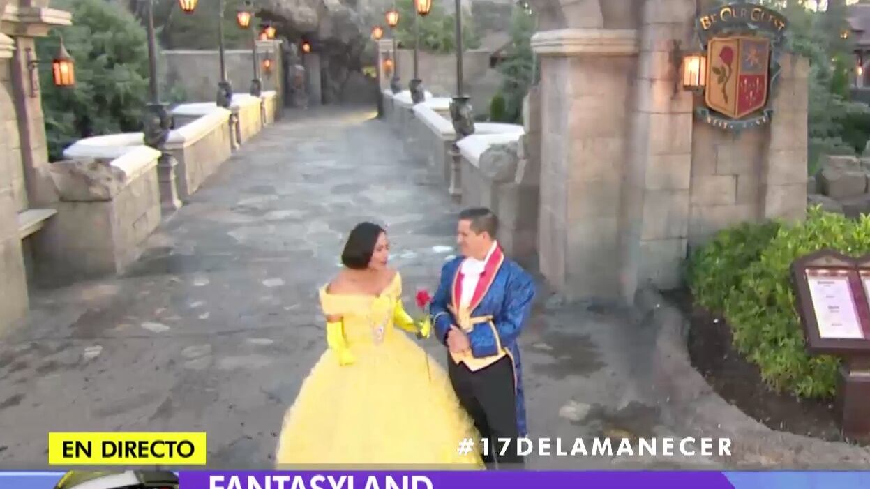 Hernández ataviada con el icónico traje amarillo que usa la hermosa “Bella”, bailó junto a Valentín en Fantasyland. En ese lugar se encuentra el castillo de la famosa película.