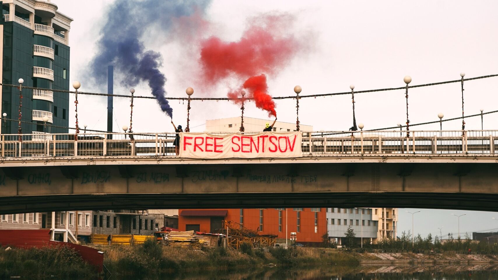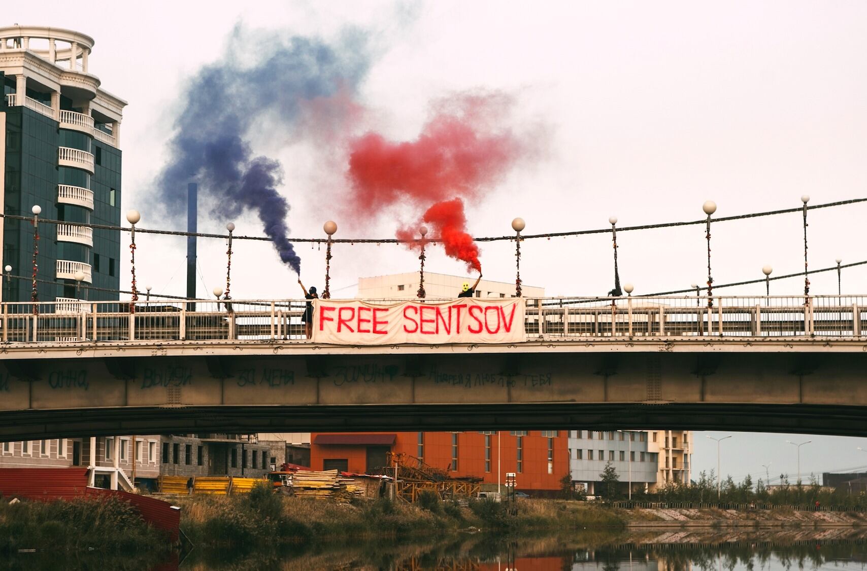 Durante la protesta del domingo en Yakutsk _donde Oleg Sentsov cumple una sentencia de 20 años_ las integrantes de la agrupación desplegaron una pancarta en un puente cercano en la que decía “Liberen a Sentsov”.