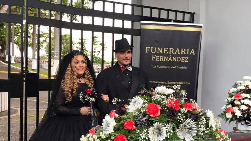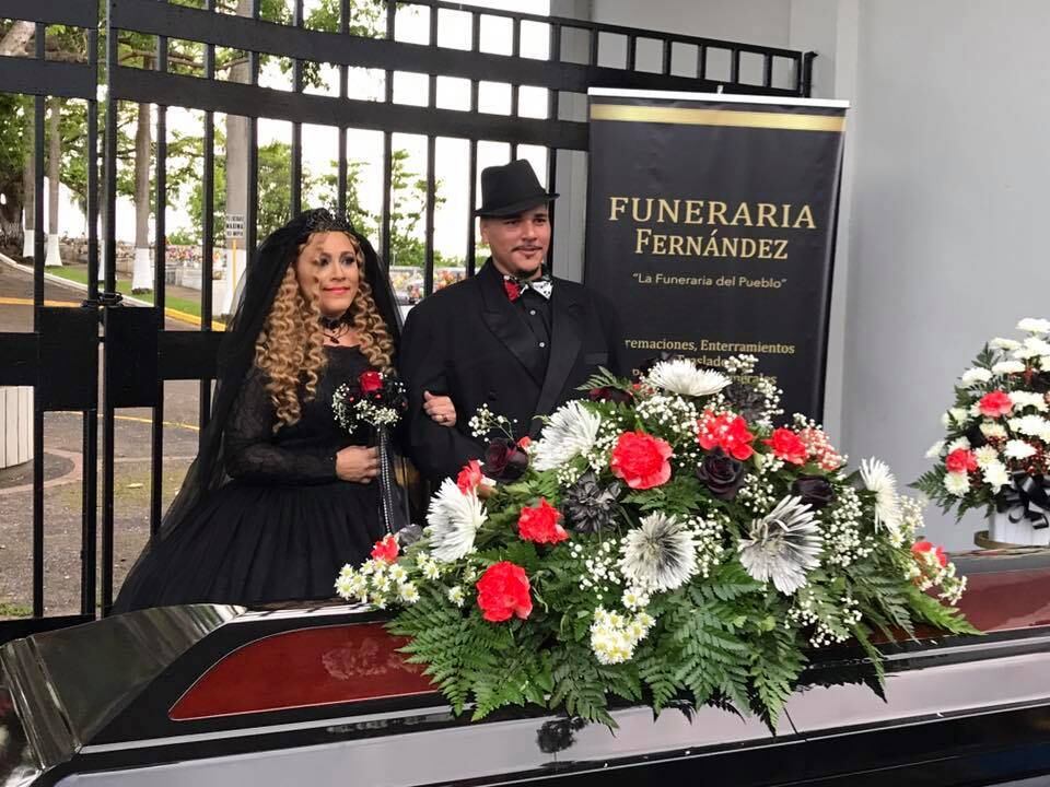 Después de 12 años de novios, Sheila Griselis Camuy Castillo —de 35 años de edad— e Ildefonso Pérez Basat —de 28— unieron sus vidas vestidos de negros y con un féretro que sirvió de mesa para celebrar.