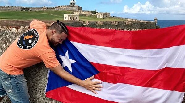 En la fotografía se puede ver al joven dominicano-puertorriqueño abrazando una gigante bandera de Puerto Rico con el castillo San Felipe del Morro.
