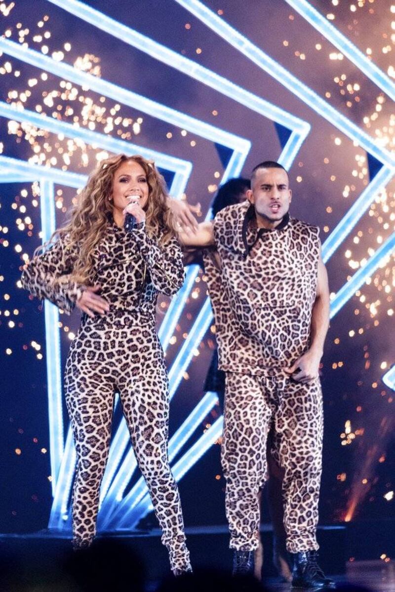 Se cambió al menos siete veces de vestuario durante la presentación de casi dos horas. Comenzó con un traje de cuerpo completo con estampado de leopardo y luego se puso un jersey que decía “J LO” con el número 13, uno de sus múltiples homenajes para A-Rod.