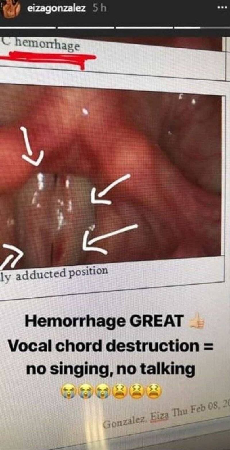 “Destrucción de cuerda vocal= no cantar, no hablar”, escribió en una historia de Instagram, donde enseñó la fotografía del estudio médico.