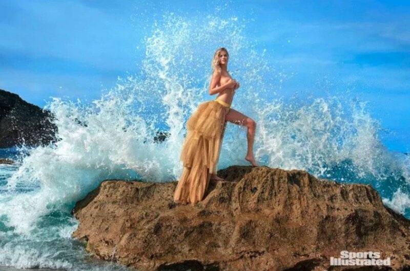 La imponente modelo posaba topless sobre una roca en la isla de Aruba cuando una ola golpeó donde ella estaba parada haciéndola perder el equilibrio y caer al mar.