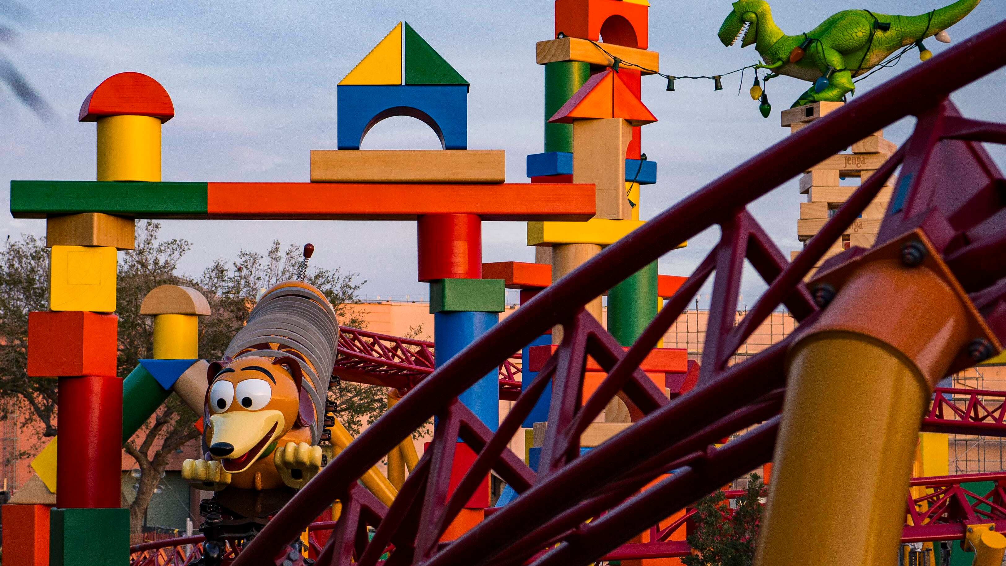 - Slinky Dog Dash: Andy ha armado una montaña rusa para la mejor diversión familiar. Las pistas y soportes en brillantes colores rojo, naranja, amarillo y azul se unen con adorables carritos de montaña rusa siguiendo el diseño dibujado a mano por el mismo Andy – con ayuda de Jessie y Rex. Y, para completar su creación, Andy seleccionó a un conocido perrito de orejas caídas y collar verde con un elástico cuerpo de resortes para liderar la pista. Slinky Dog Dash está inspirada en el encantador sabueso Slinky, el clásico juguete americano de los años 1950. Los participantes de todas las edades se divertirán mientras Slinky Dog dobla y enrosca sus resortes en curvas, subidas, puentes y bajadas. Los pasajeros volarán alrededor y por encima de Toy Story Land disfrutando de las vistas panorámicas que la nueva área temática ofrece. La colorida creación de Andy estirará a Slinky Dog y sus resortes al máximo – desde su cabeza a su cola – y será pura diversión para toda la familia.