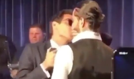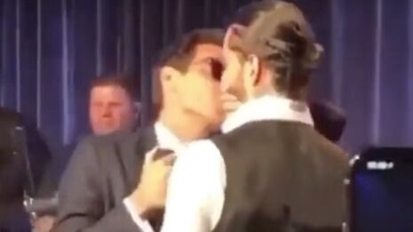 Mientras entonaban un famoso tema, Marc simuló besar a Maluma en la boca ya que puso su mano al momento de hacerlo.
