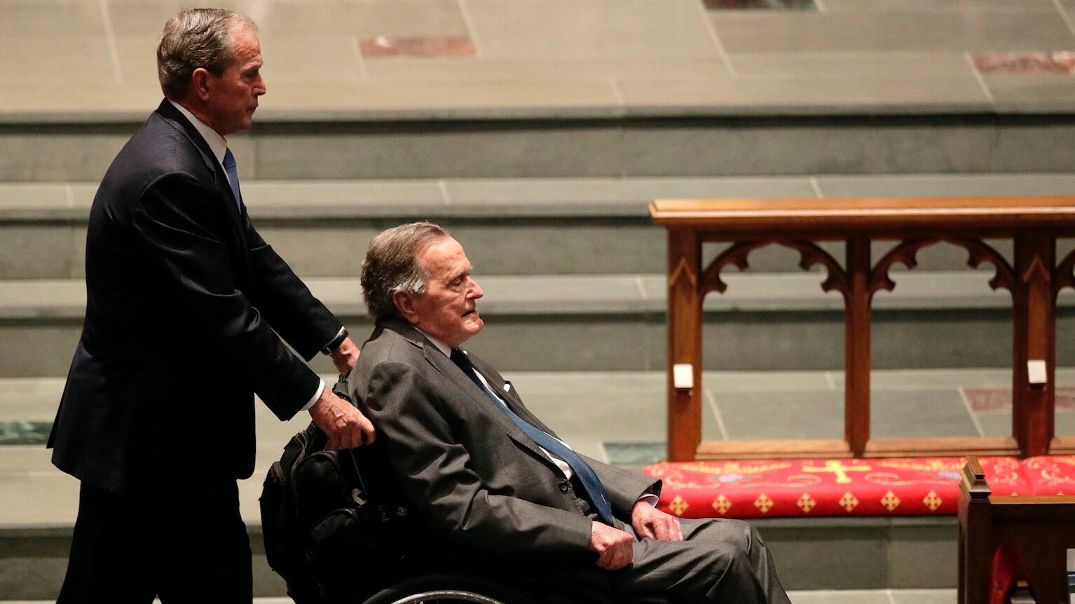 George H.W. Bush se traslada en silla de ruedas o en carrito eléctrico desde que empezó a sufrir síntomas de la enfermedad de Parkinson, y en años recientes ha tenido que ser hospitalizado por problemas respiratorios y otras infecciones.