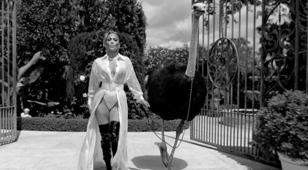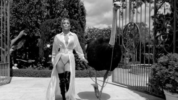 En el mismo, López se pasea con un avestruz y destruye un lujoso auto.
