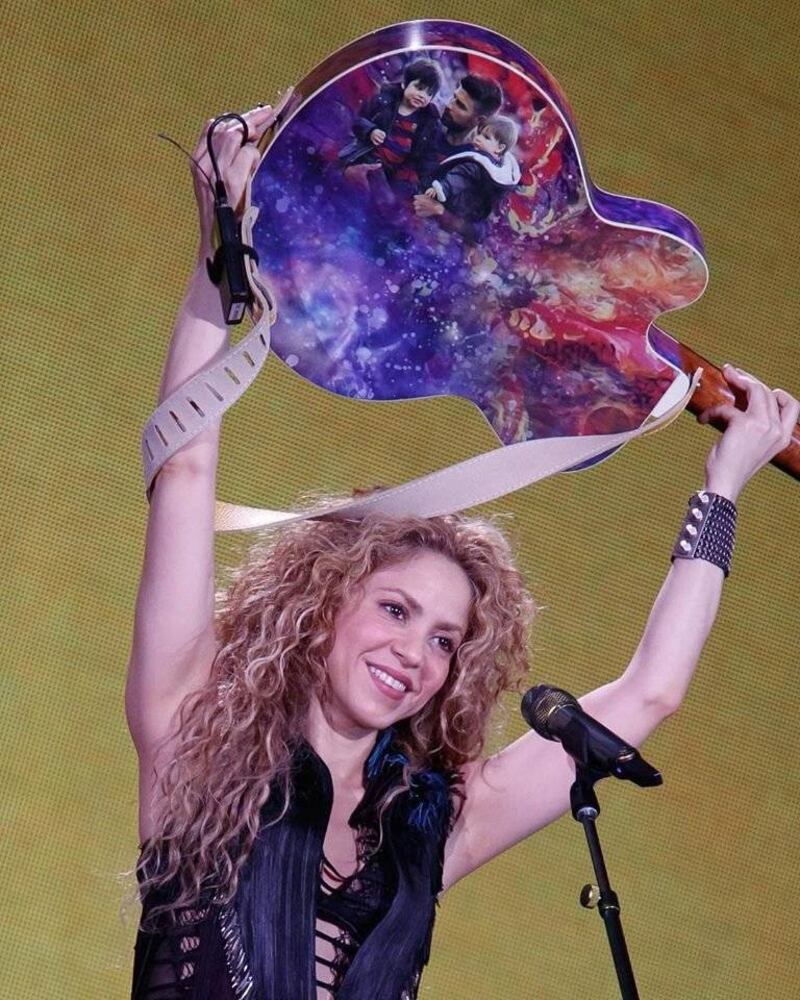 “Hoy en Amsterdam, Sasha y Milan viendo a su mami por primera vez en concierto”, expresó la artista en sus redes sociales con una foto donde aparece el trío grabado en su guitarra.