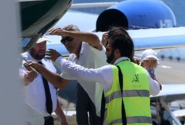 George Clooney fue captado recibiendo ayuda para poder abordar un avión privado junto a su familia. En las imágenes se puede ver que su esposa lleva en sus brazos a su hija, Ella. La niñera sostiene a Alexander, el otro hijo del actor.