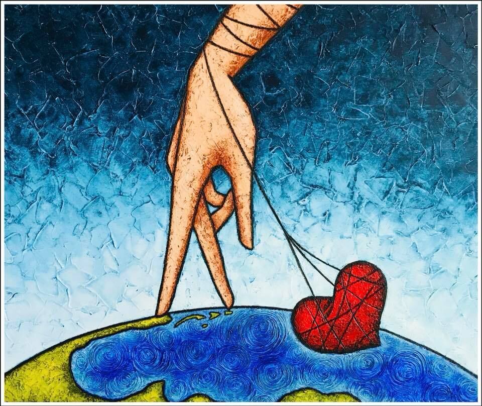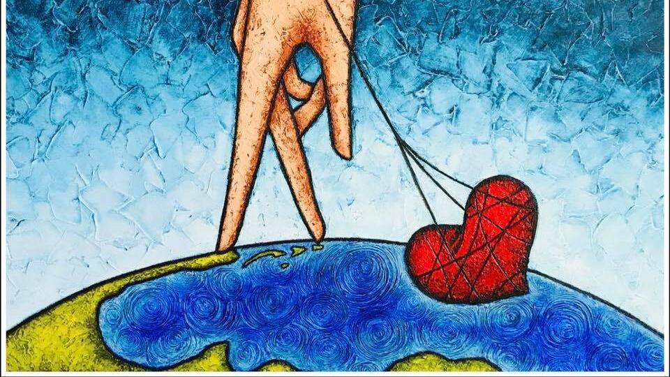 “La primera es una pieza donde hay una bola del mundo, una mano que está sobre el Caribe con un dedo en Puerto Rico y otro en Florida, y el elemento de un corazón arrastrado es como yo me sentía cuando salí de mi país, arrastrando mi corazón porque no me quería ir, pero tuve que hacerlo”, reveló sobre la obra con la que comenzó su catarsis creativa y que tituló “Corazón foráneo”.