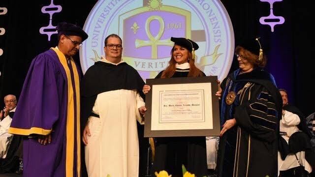 A la novicia Sor Juliana Cruz, quien ganó popularidad por su participación en el programa “Master Chef” (Telemundo), le dieron un reconocimiento para las Hermanas Dominicas del Rosario de Fátima por el apoyo y la ayuda brindada por esta congregación a la universidad.