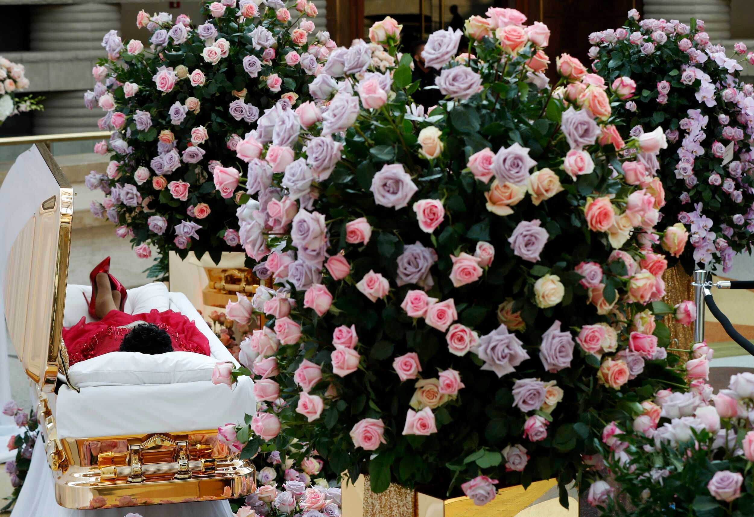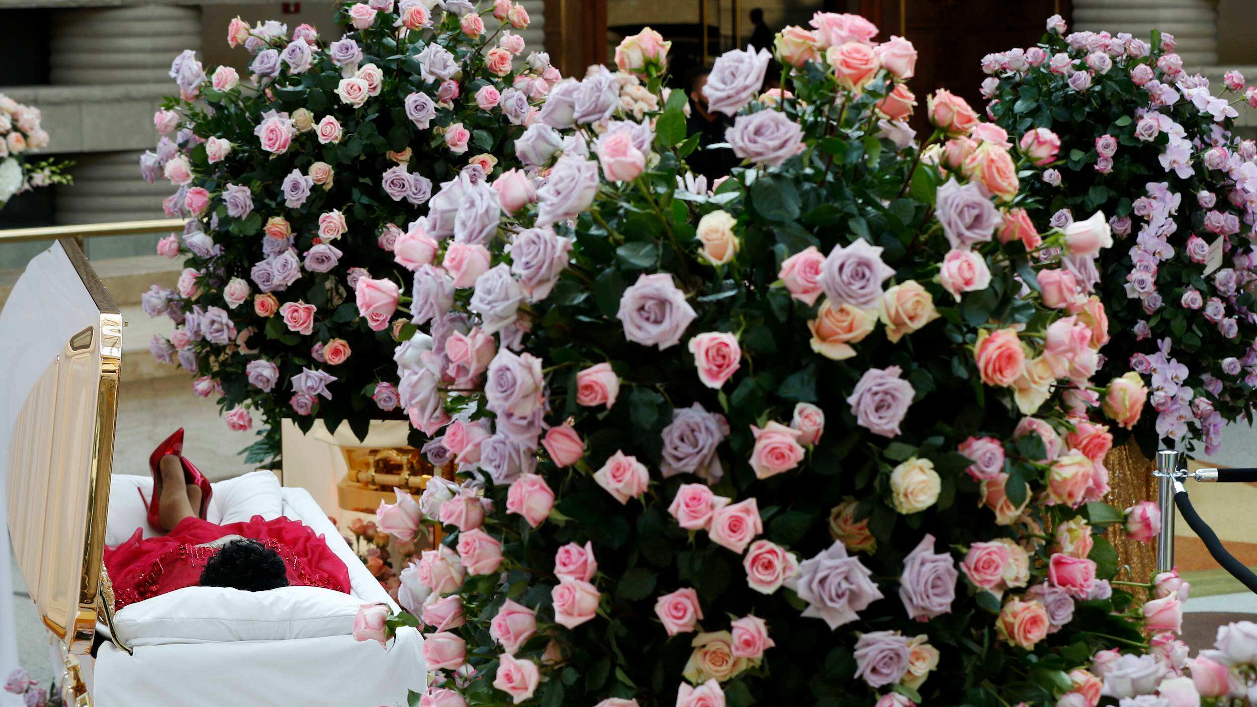 Se acercaron al féretro bañado en oro mientras al fondo sonaban sus grabaciones de góspel. Yacía en reposo, vestida de rojo de la cabeza a los pies, con zapatos de tacón alto.