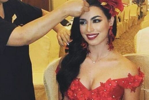 La también modelo y animadora llevó un traje rojo corto de frente y largo atrás, donde dejó ver sus piernas y lució una flor en su cabeza. Además, sacó un abanico rojo al final de su pasarela.