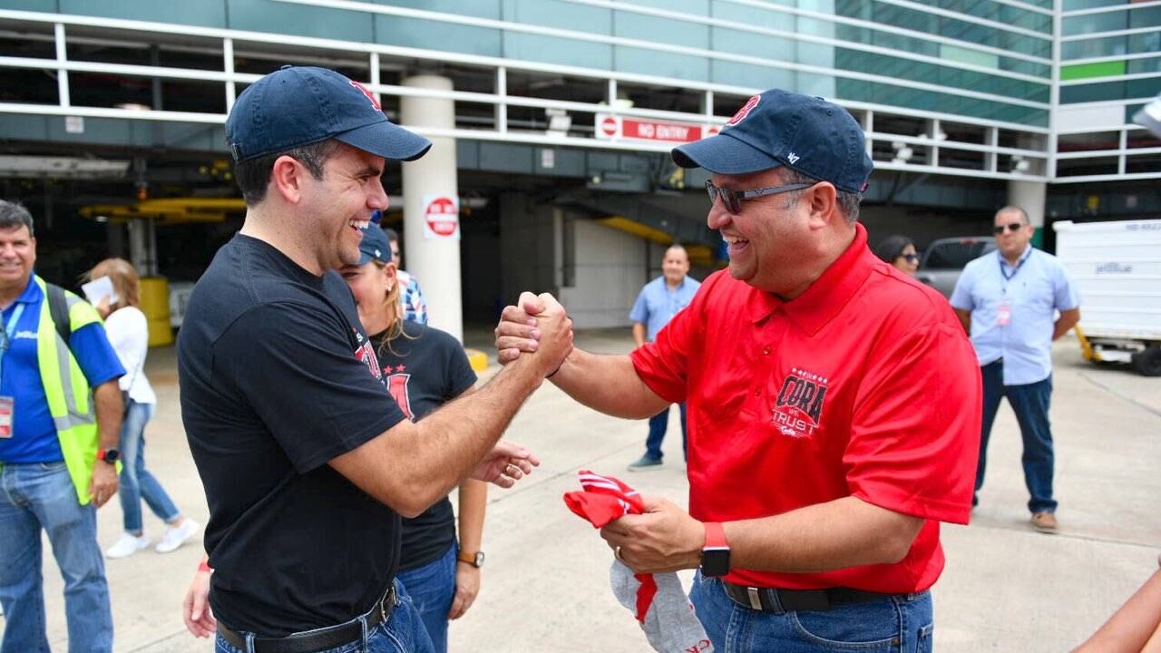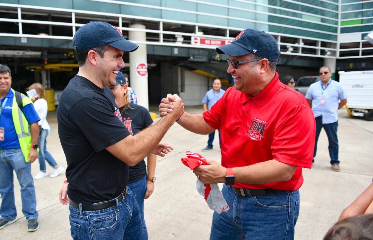 Los dos funcionarios se encontraron en el Aeropuerto Internacional Luis Muñoz Marín, donde se fundieron en un abrazo y salieron junto a Cora y el equipo y dueños de los Medias Rojas de Boston.