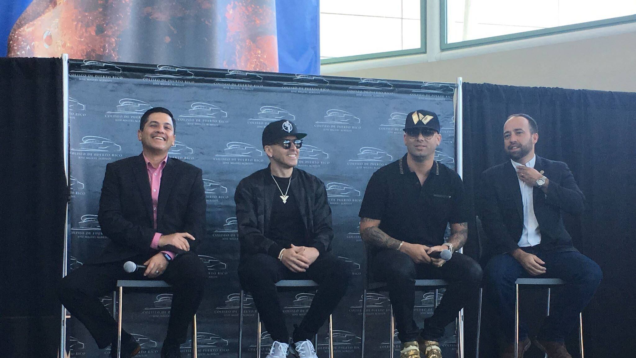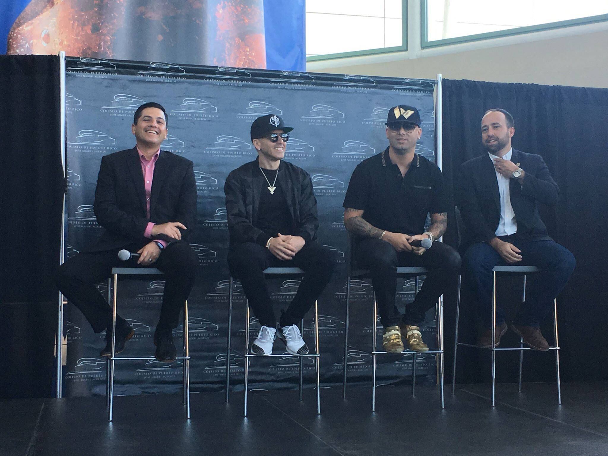 El director ejecutivo de la Autoridad del Distrito para el Centro de Convenciones de Puerto Rico, Omar Marrero, y el gerente general del Coliseo de Puerto Rico, Eduardo Cajina, develaron hoy en el Coliseo de Puerto Rico, los primeros banderines conmemorativos para los exponentes de música urbana Wisin y Yandel.