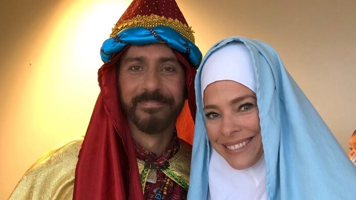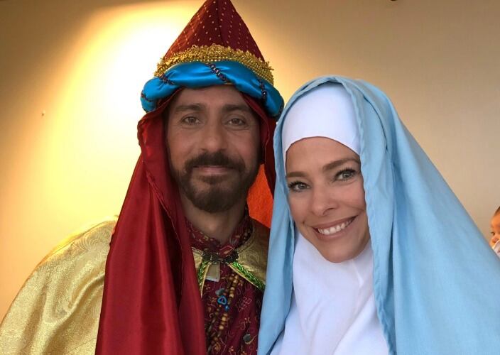 Bacó compartió las imágenes a través de su cuenta de Twitter, donde aparece junto a su exesposo, vestida de María y este vestido de Rey Mago, con motivo a la celebración de la Navidad.