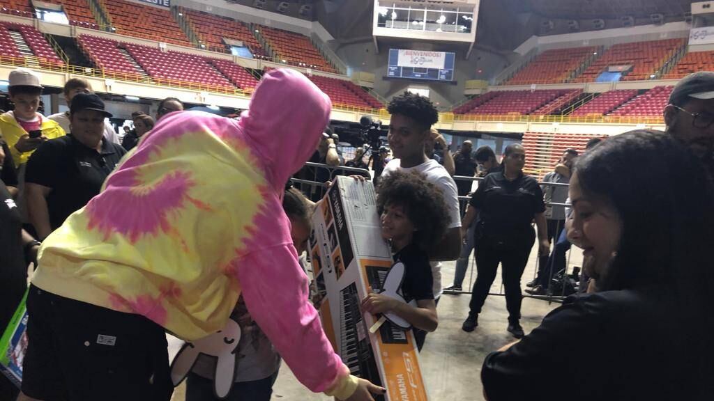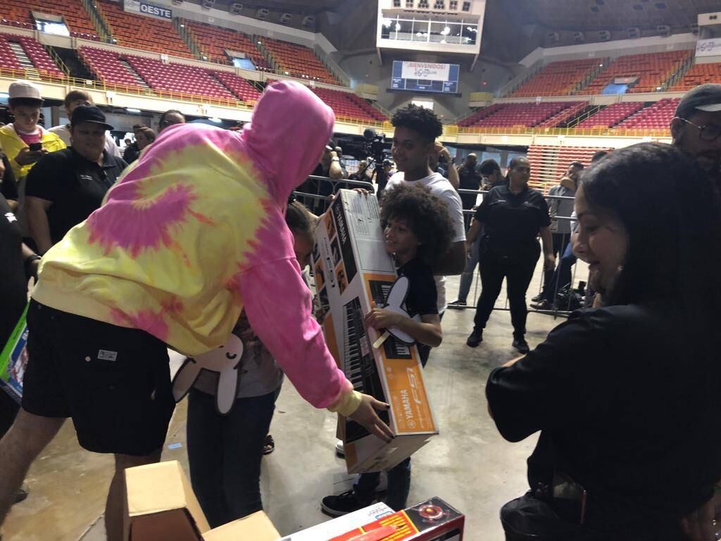Entre lo repartido abundó los instrumentos musicales como pianos, baterías, guitarras, violines, bocinas y flautas dulces. El artista también repartió juguetes deportivos como bolas de baloncesto y volleyball, kits de bateo y canastos.