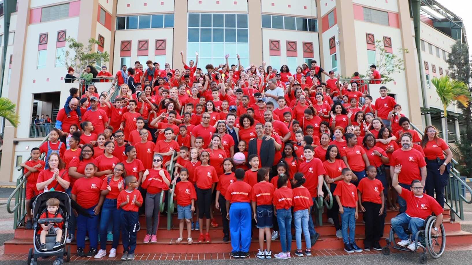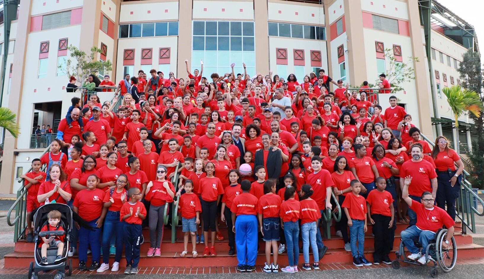 Unos 500 chicos de los programas deportivos y recreativos de la Ciudad de Carolina se vistieron con una camisa roja- en representación del color del equipo de los famosos en la competencia Exatlón en el que participa la carolinense Carla Cortijo.