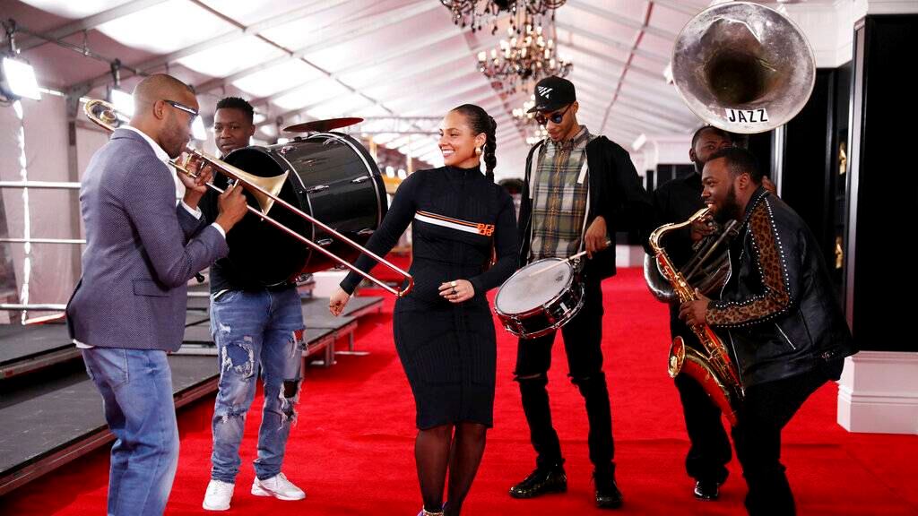 La anfitriona del Grammy Alicia Keys ayudó a desenrollar la alfombra roja y bailó al ritmo de funk mientras Trombone Shorty tocaba con miembros de su banda.