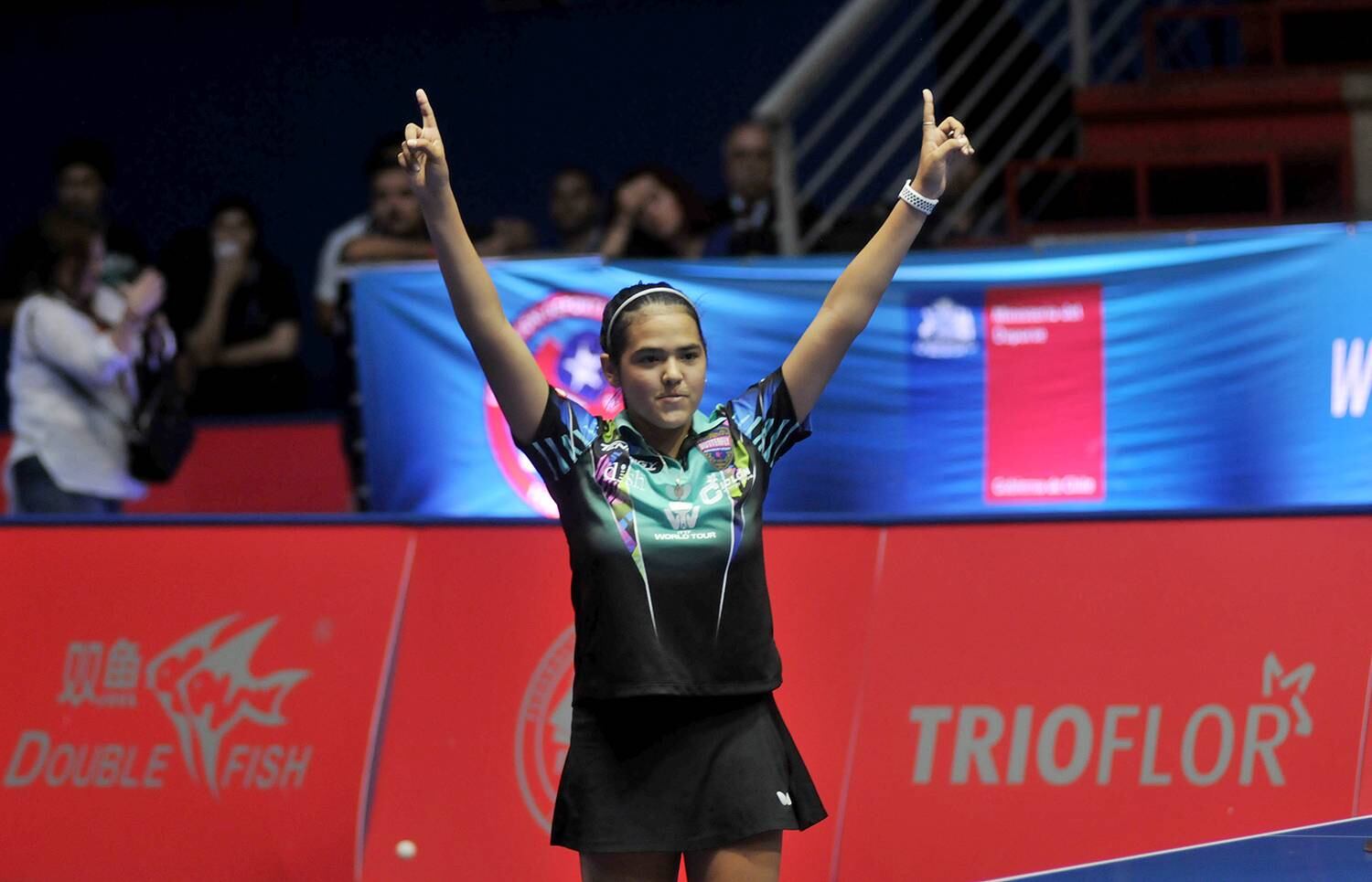 Asimismo, la pantalla de la tarima proyectó imágenes y vídeos de pasados partidos de la tenimesista.