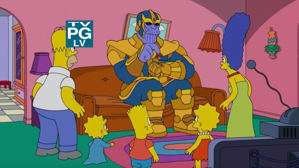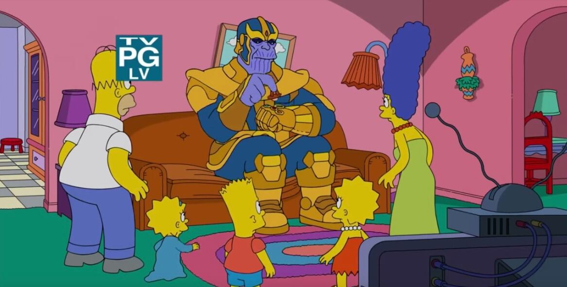 Durante los 30 años que la familia amarilla lleva en la tv, ha generado un sin fin de escenas de entrada, las cuales involucran un gran reto artístico para los creadores. En esta ocasión en uno de los nuevos episodios, denominado ’The Girl on the bus’ , el malvado Thanos a parece sentado en el sofá de Los Simpsons, donde con el chupon de Maggi completa las gemas del infinito. Al tiempo que chasquea los dedos y hace desaparecer a todos los miembros de la familia, excepto a la pequeña bebé quien se sienta junto al Titan.