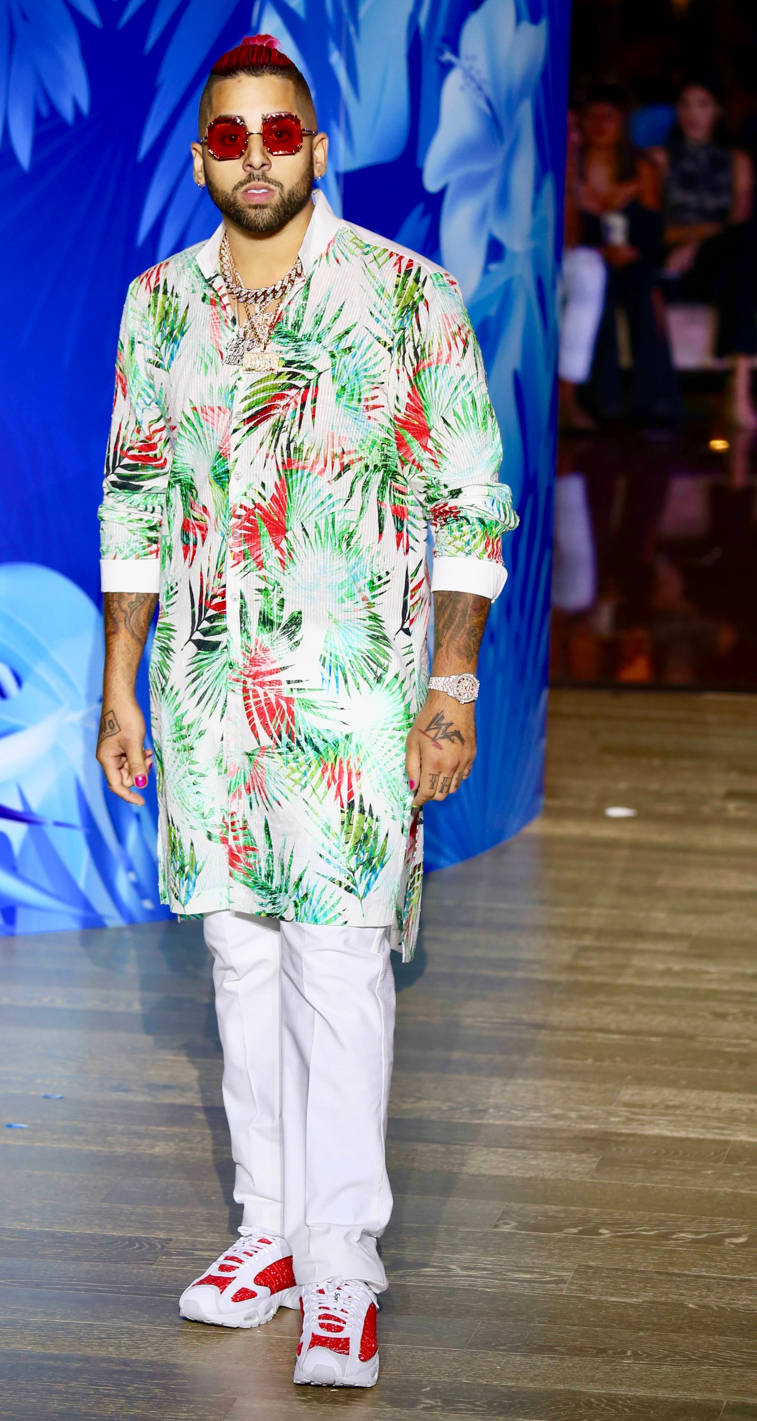 Sin duda, uno de los más aplaudidos y que mayor soltura desplegó en la pasarela fue el rapero y productor Jon Z, quien vistió pantalón blanco con un vistoso jacket negro bordado con símbolos en lentejuelas , caravelas, labios, alas de angel y estrellas, de la colección “Oversize” del diseñador puertorriqueño David Antonio.