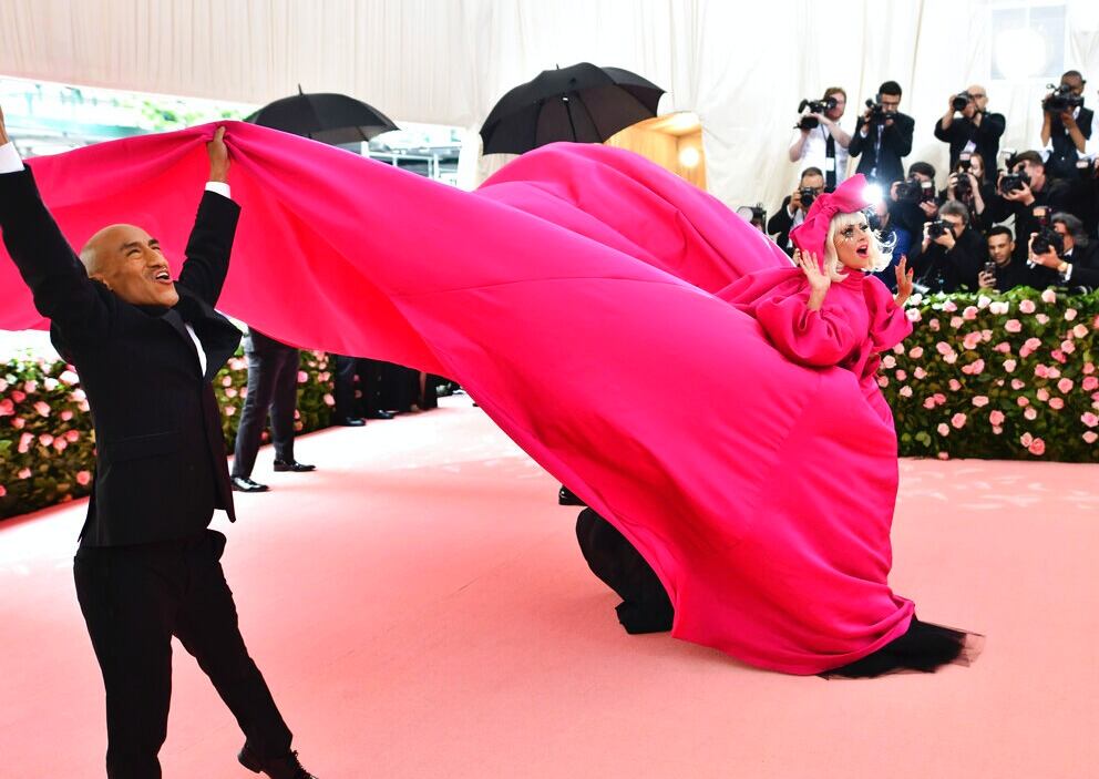 Brandon Maxwell, quien creó el modelo, ayudó a Gaga a subir por las escaleras del Museo Metropolitano de Arte mientras posaba rodeada por varios asistentes que llevaban grandes sombrillas. Maxwell le retiró el vestido revelando otro vestido negro asimétrico con una enorme cauda lateral. Gaga se quitó el segundo vestido para revelar otro rosado que recordaba a Marilyn Monroe en “Los caballeros las prefieren rubias”, con el cual caminó nuevamente por la alfombra rosa.