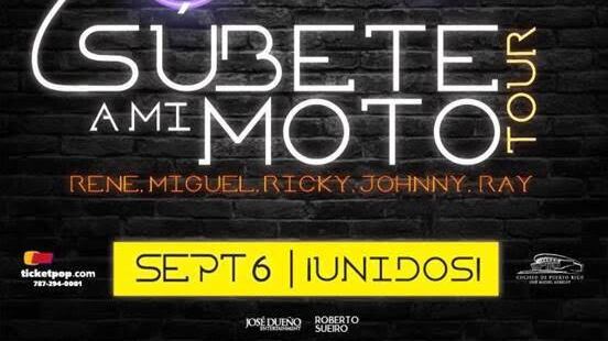 La venta de boletos para el concierto en Puerto Rico de “Súbete a mi Moto Tour” comienza este viernes 14 de junio a través de Ticketpop (787.294.0001; www.ticketpop.com) y en la boletería del Coliseo de Puerto Rico.