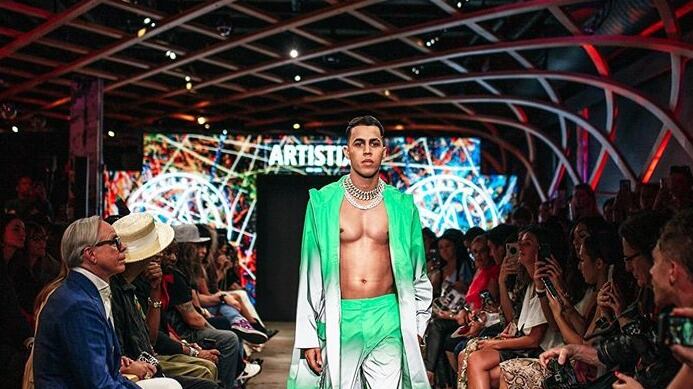 Con el pecho expuesto, y prendas color verde esmeralda, el regguetonero, Brytiago, se destacó en la pasarela de NYFW por el mismo magnetismo por el cual es reconocido musicalmente.