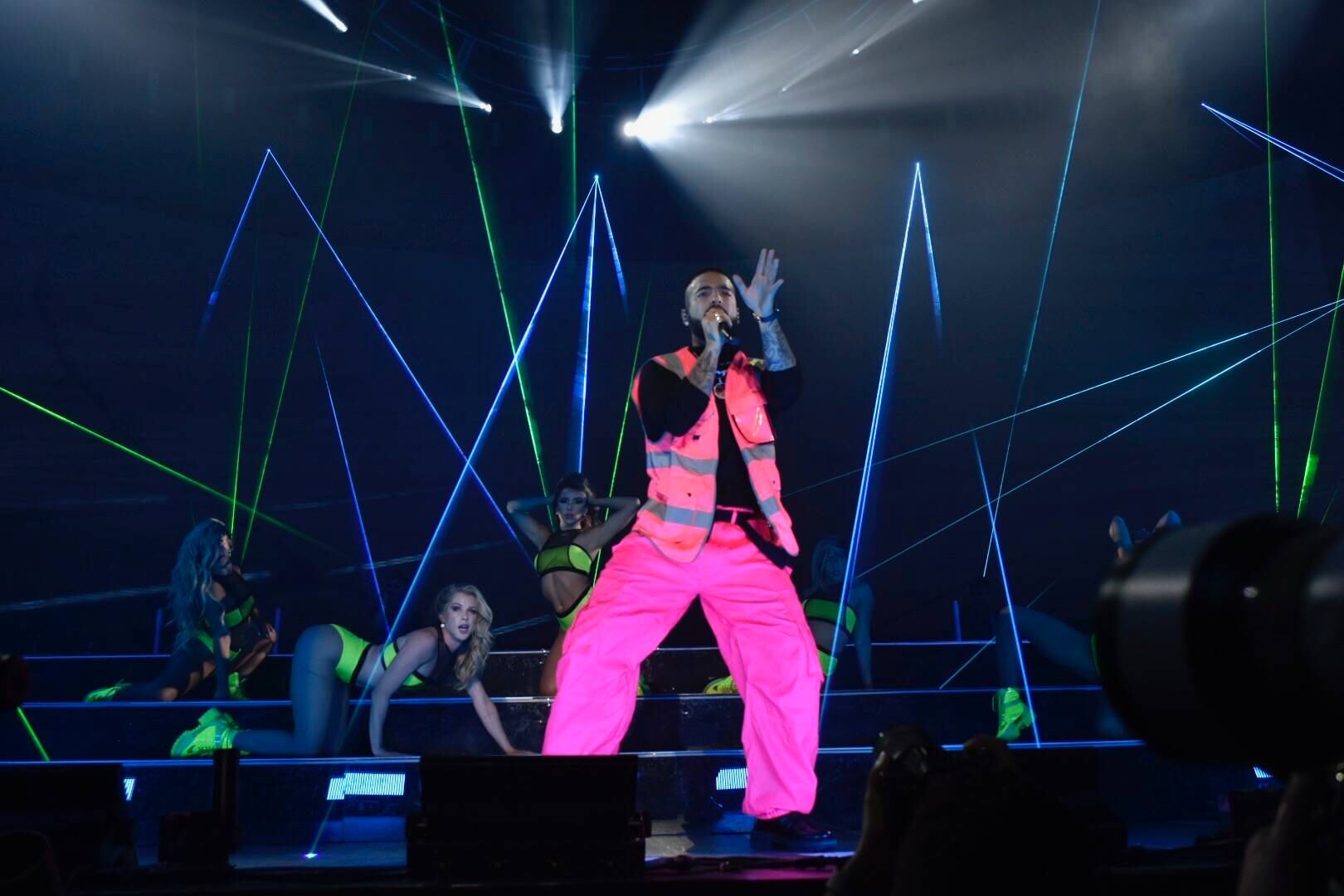 Luego de una introducción visual futurística, el parcero inicio el show vestido de neón al son de la canción “Mala mía”, seguida de “Corazón”, “Vente pa’ acá” (popularizada por Ricky Martin), “No se me quita” y “Chantaje”.