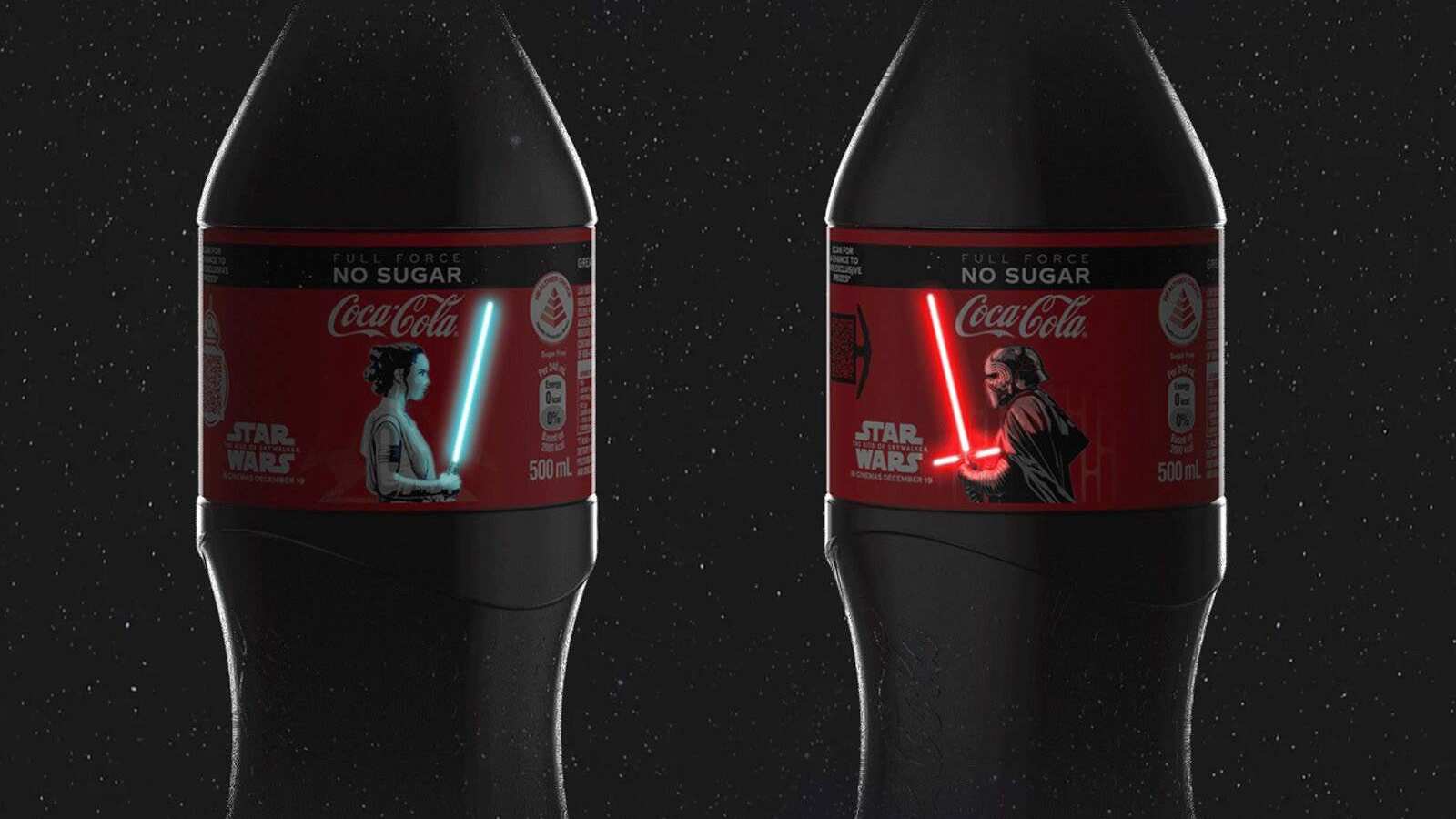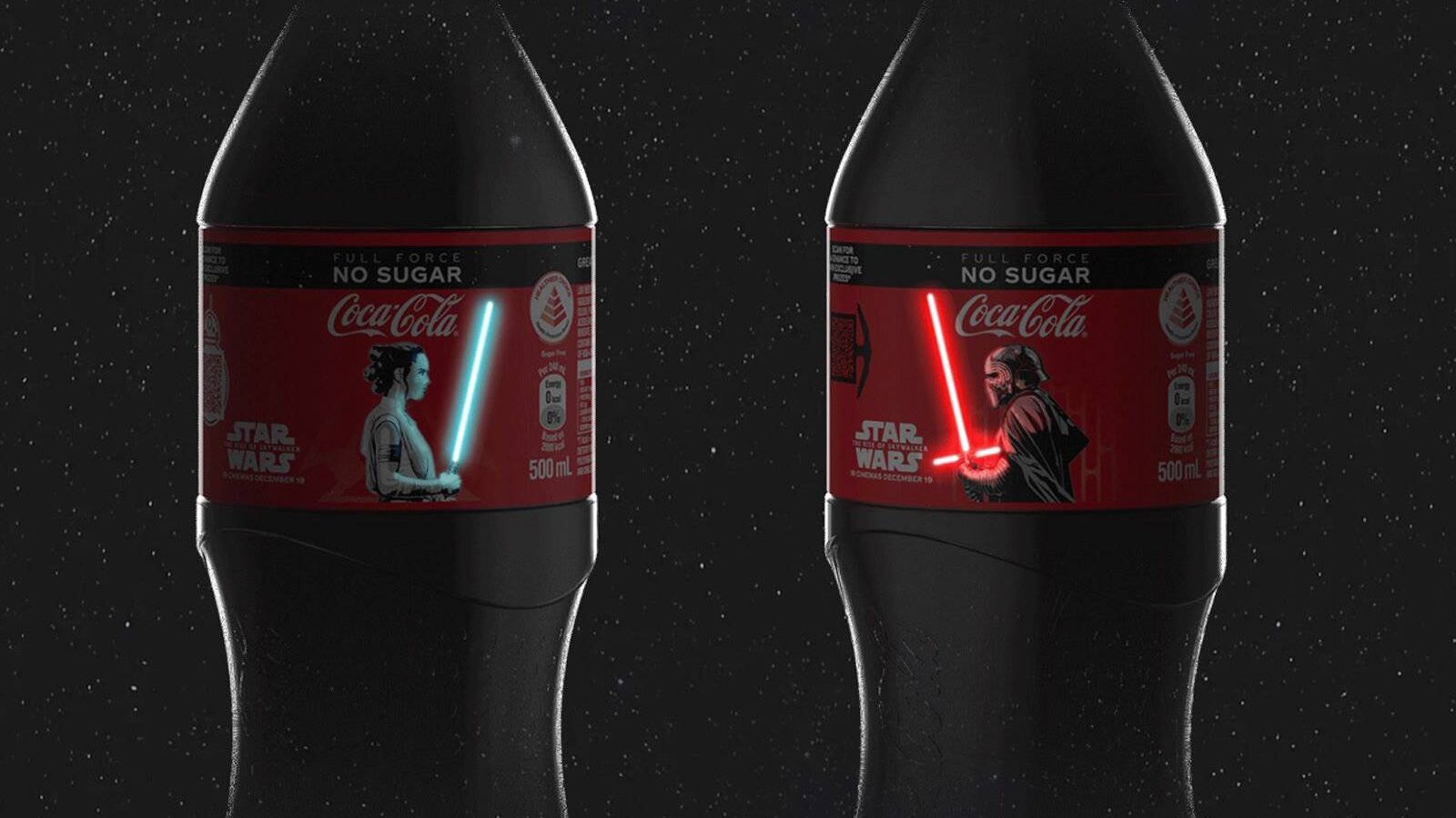 Con la llegada de Star Wars: The Rise of Skywalker que saldrá el 20 de diciembre, comienzan a salir los productos relacionados con esta nueva película, y uno de ellos son las botellas de Coca-Cola que cuentan con los personajes principales Rey y Kylo Ren, con espadas de luz que se iluminan cada vez que tocas las etiquetas.