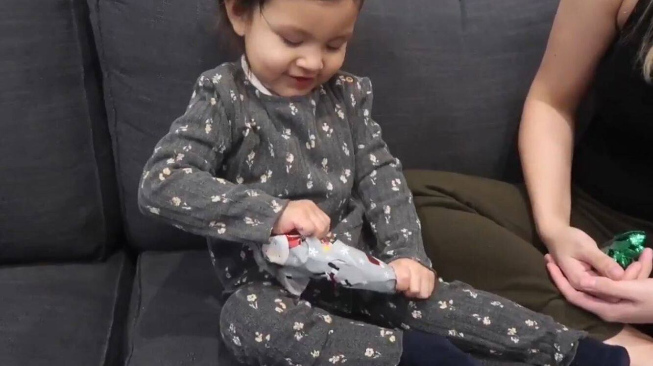 Después de lograr abrir el regalo, la niña le pidió a su mamá que le quite la cáscara sin dejar de gritar por la alegría. La pequeña se comió la fruta en ese mismo instante.