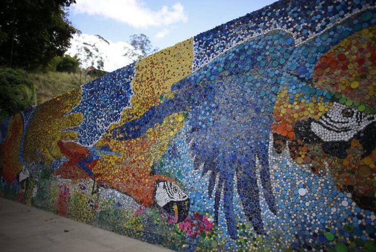 El mural, de 43 metros de largo y una altura que varía de los tres a los siete metros, está integrado por más de 200.000 tapas plásticas de botellas de gaseosas y envases de alimentos, medicinas y productos de aseo personal y limpieza que aportaron miles de habitantes invitados a participar en el proyecto a través de las redes sociales y la empresa local MultiRecicla, que se dedica a recolectar y almacenar materiales reciclables.