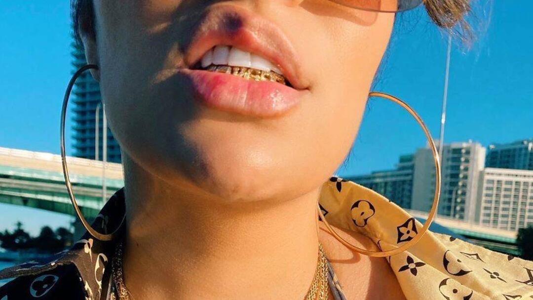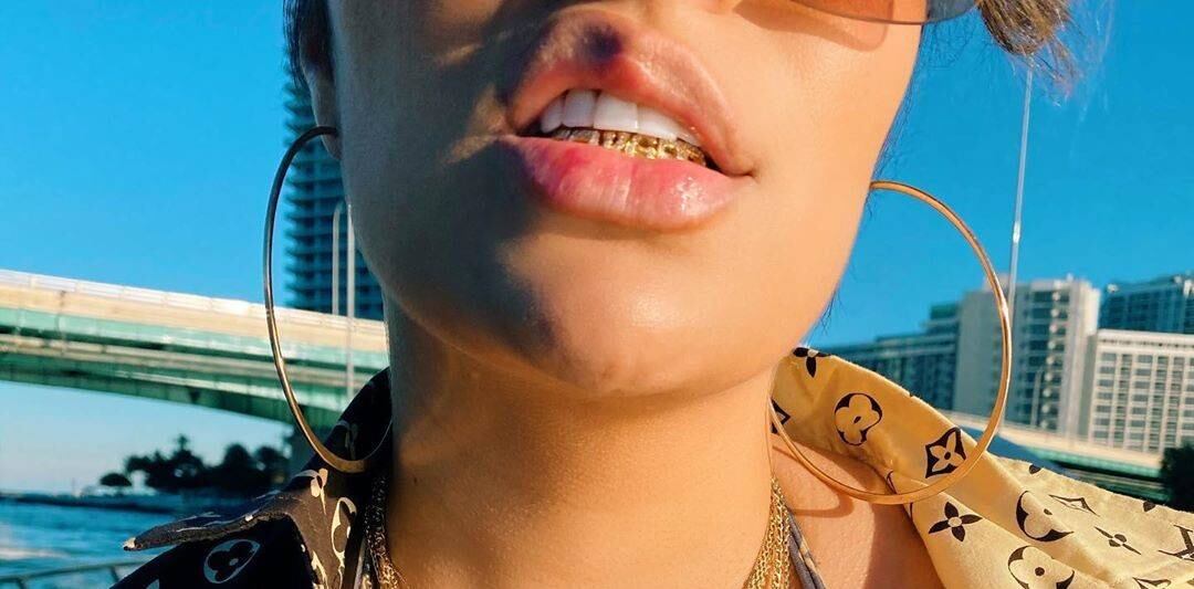 En una imagen que compartió en su cuenta Instagram, la reguetonera en una pose muy sensual, dejó entre abiertos sus labios, para exhibir su ostentosa compra: sus iniciales colocadas en unas piezas dentales inferiores, que brillaban en color oro.
