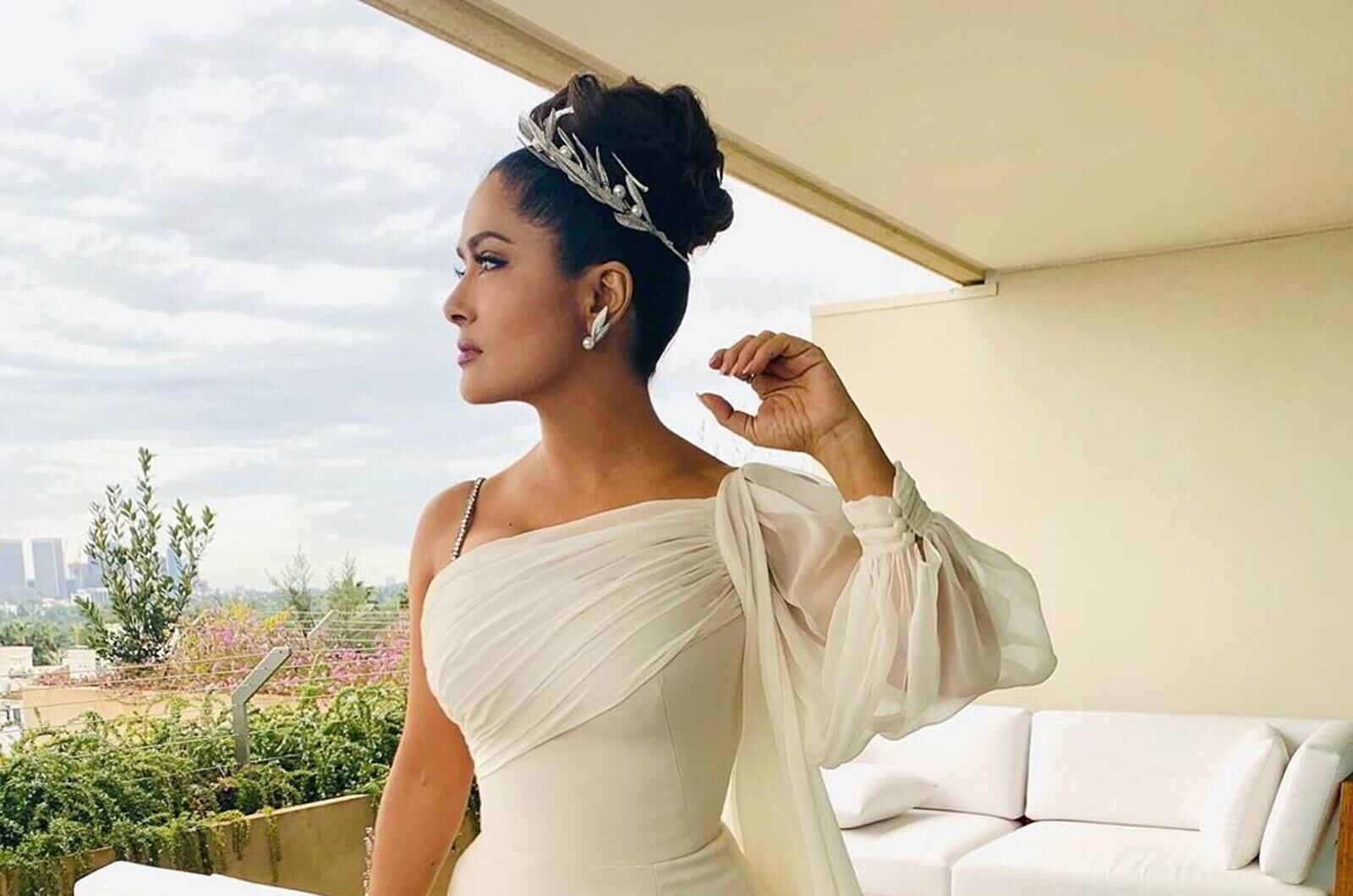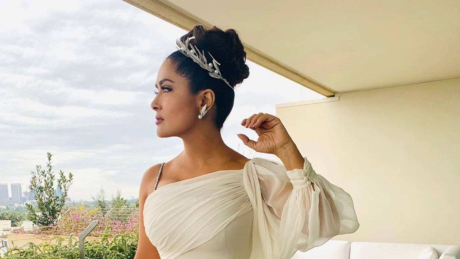 Lo más hermoso del look de Salma Hayek en los Oscars fuesu peinado. Para esta ceremonia usó un moño hacia arriba con una diadema de hojas plateadas. Por este detalle, en redes sociales aseguraron que tenía un estilismo muy griego.
