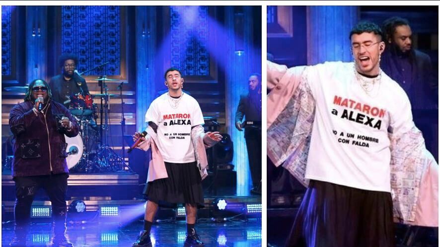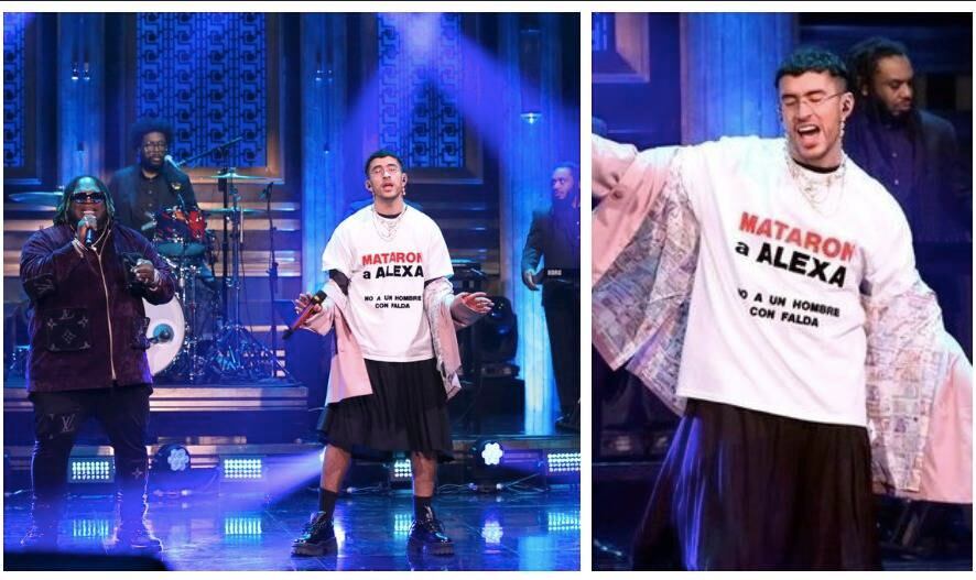“Mataron a Alexa, no a un hombre con falda”, leyó la camisa que utilizó Benito en su actuación en el programa de Fallon, donde interpretó su nuevo tema junto al panameño Sech.