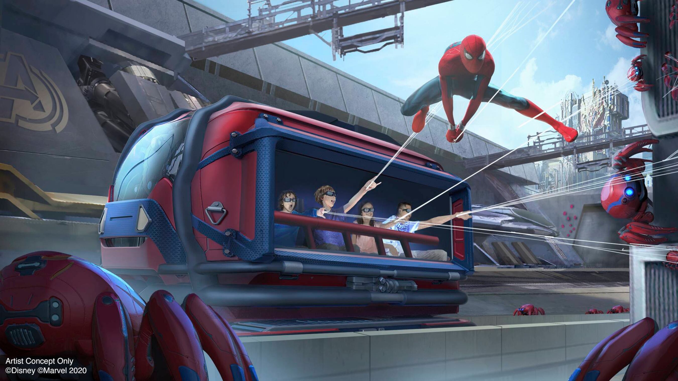 Con ese objetivo en mente se creó “WEB SLINGERS: A Spider-Man Adventure”, que usa una combinación de imágenes físicas y digitales para permitir que los visitantes viajen cual Hombre Araña con Peter Parker en la pantalla. La atracción comienza en una casa abierta donde Spider-Man (interpretado por Tom Holland) muestra unas arañas robot pequeñas pero poderosas que él y un equipo de adolescentes creativos conocidos como la Brigada Mundial de Ingeniería, o WEB por sus siglas en inglés, desarrollaron en un viejo edificio donado por Tony Stark. Por supuesto que los robots, capaces de autorreproducirse, se salen de control y comienzan a invadir el lugar, y los visitantes son llamados a ayudar a capturarlos.