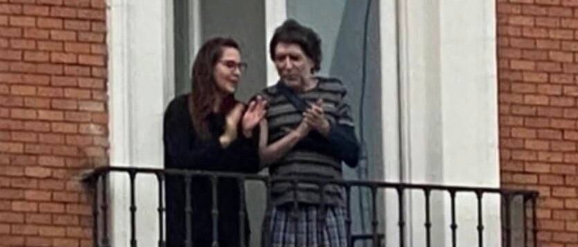 El artista de 71 años se dejó ver en el balcón de su casa en la plaza Tirso de Molina de Madrid, junto a su pareja, Jimena Coronado, a las ocho de la noche, hora en la que los españoles brindan aplausos al personal médico del país, en señal de apoyo y agradecimiento por su trabajo para combatir el coronavirus.