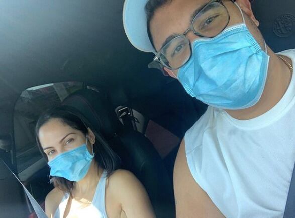 Acompañada por el productor de música urbana, Rafael “Raphy” Pina, quien comenzó la transmisión desde un comercio, ambos revelaron el resultado de la prueba una vez salió del baño del local.