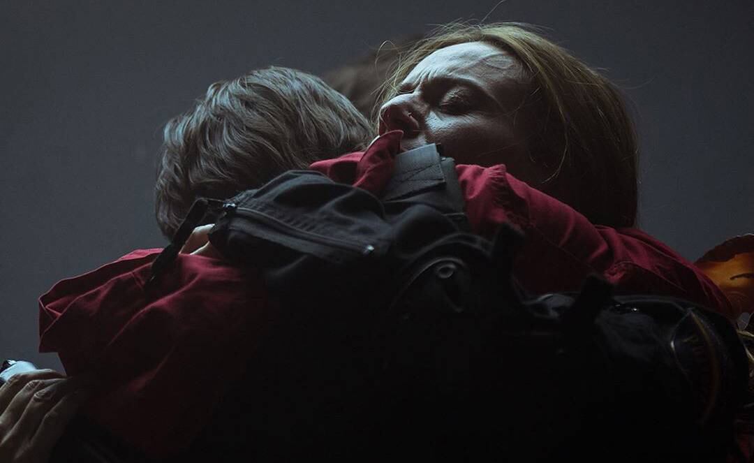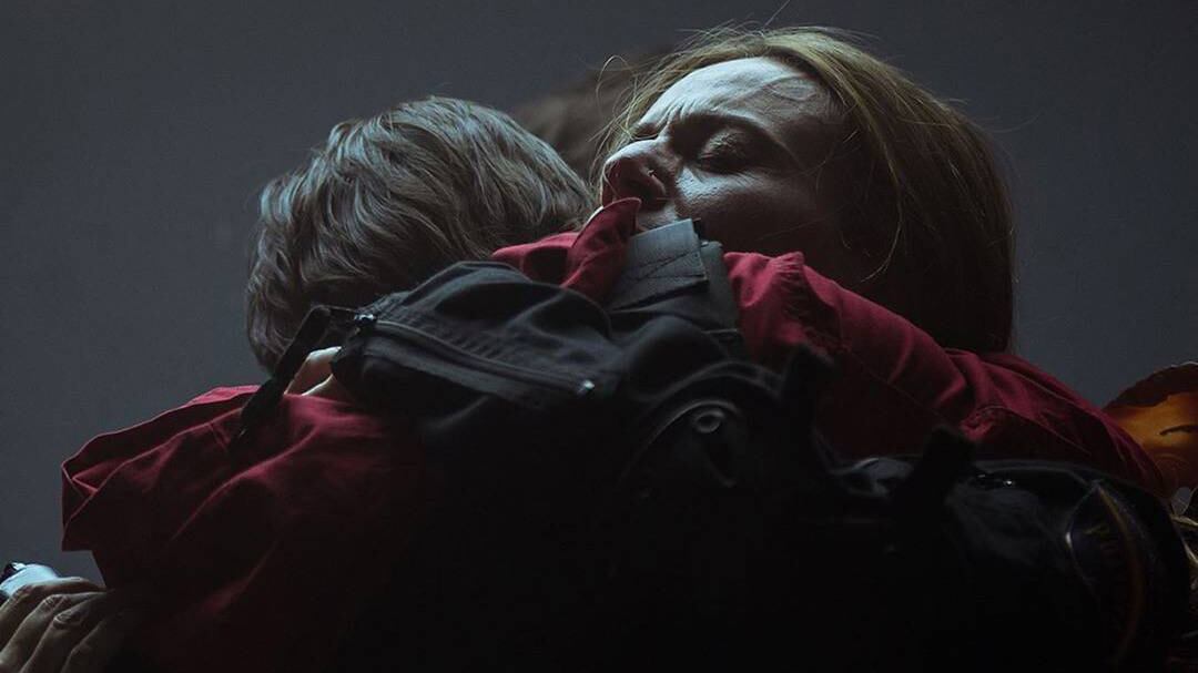 Ahí, la atracadora lleva puesto un vestido rojo, ojo con ese color, y está acostada en el césped. Cuando se pone de frente se toca el estómago con su anhelo de embarazo. Luego se ve a los tres personas que ya habían muerto, sonreírle con cariño: Oslo, Moscú y Berlín.