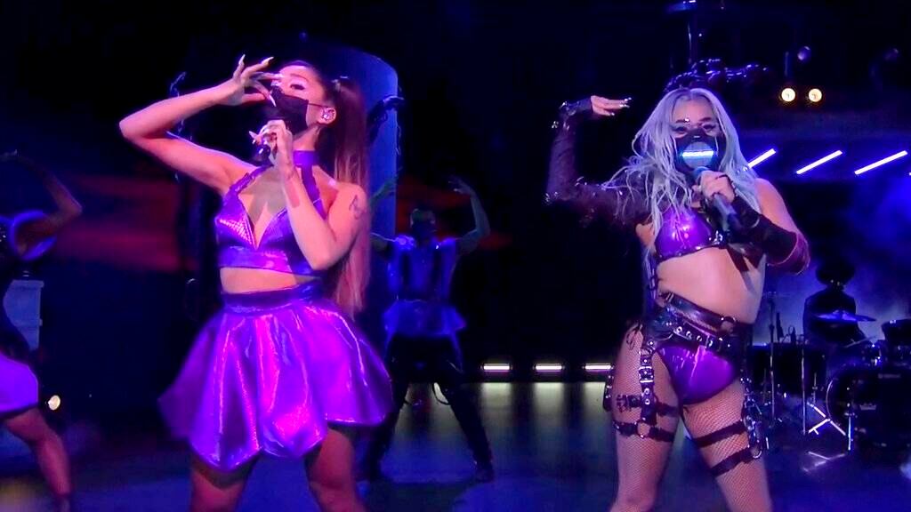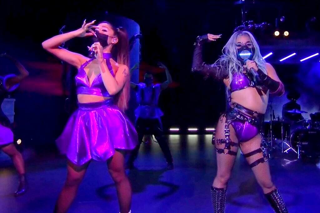Con una mascarilla electrónica, interpretó un medley de sus canciones, entre ellas “Stupid Love”, “Chromatica II” y “911”. Gaga y Grande estuvieron acompañadas por un cuerpo de bailarines, todos con mascarillas.