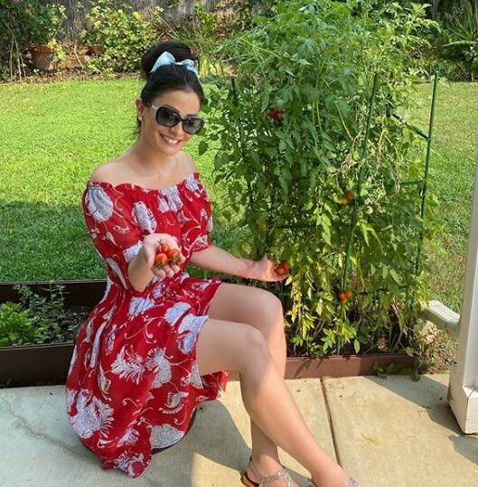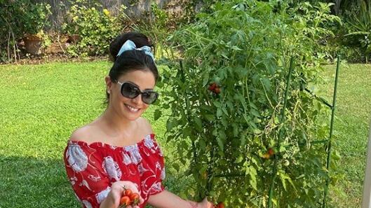 Torres posó con un traje rojo sosteniendo unos tomates recién sacados de la planta, y una sonrisa de satisfacción por el logro de plantar su propia comida.