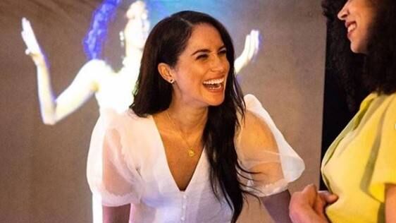 Meghan Markle hermosa con un vestido blanco estilo camisón