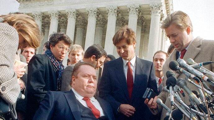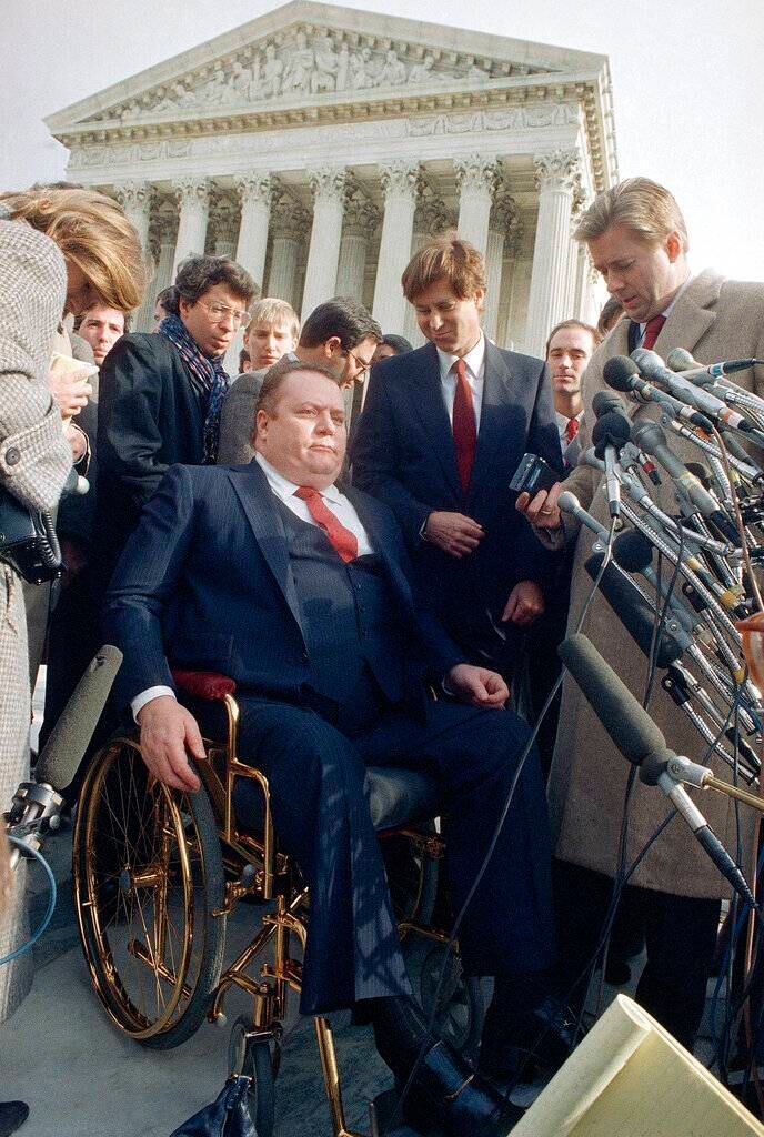 Flynt se apuntó una sorpresiva victoria en la Corte Suprema federal contra el reverendo Jerry Falwell, quien lo había demandado por difamación porque un anuncio sobre un licor publicado en 1983 en Hustler insinuaba que Falwell había perdido su virginidad con su madre en una letrina.