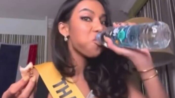 Las beldades tuvieron que grabarse comiendo exquisiteces de Tailandia, donde se realiza la octava edición del concurso de belleza.