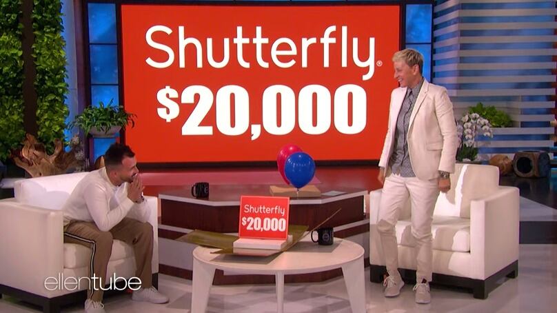 Al finalizar la entrevista, Ellen trajo la caja en la que el maestro recoge sus donaciones, y al abrirla reveló que junto a Shutterfly donarían $20 mil al maestro por su labor.