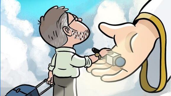 En la ilustración publicada en sus redes sociales, Bayón plasmó al periodista entrando al cielo con una maleta y micrófono en mano, que se le ve entregando a una mano que parece representar a Dios.