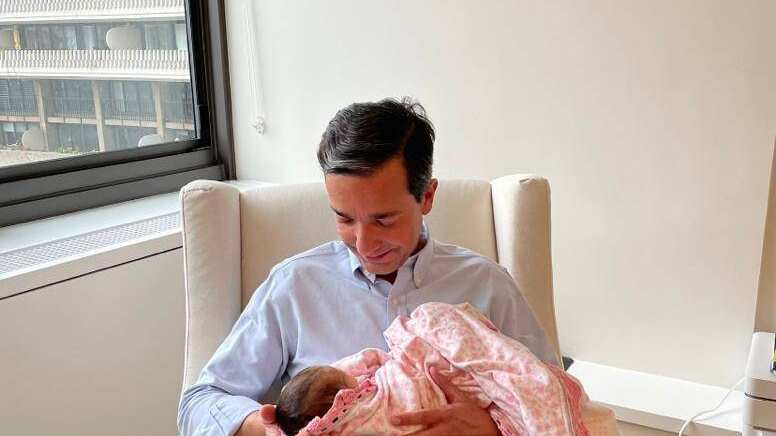 En la imagen compartida por el exgobernador, se le ve sonriendo mientras sostiene en brazos a la nueva integrante de la familia.