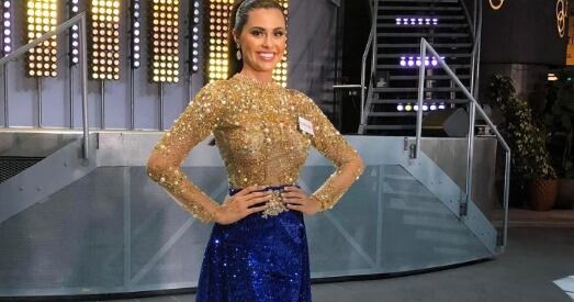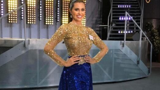 La puertorriqueña Aryam Díaz Rosado, quien es la anfitriona del certamen, utilizó un vestido brillante color azul de Luis Rentas.
